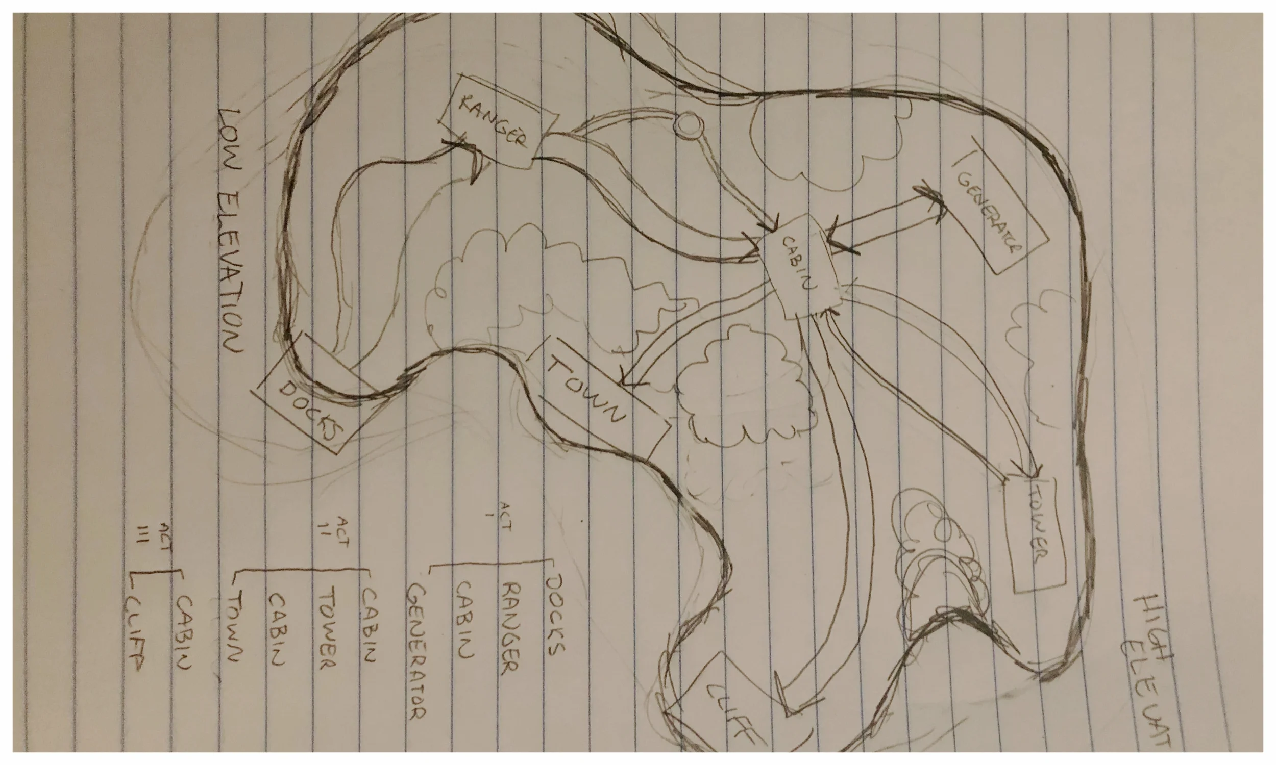 I mapped out the major locations of the level and drew their connections, or edges. Here, the width and length of an edge determines the distance and directness of the path. For example, between the dock and ranger station is a short, direct path. The arrows at the end of the edge represent one or both way paths.